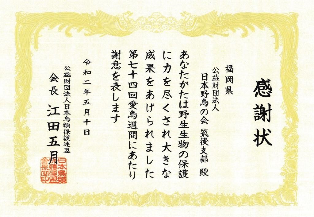 - 2020/05/28(木) 鳥類保護連盟より感謝状をいただきました。